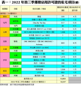 按地區劃分,今年首三季新界區有19個項目落成,涉及單位總數10,869伙,佔同期整體私宅落成量約65.5%;九龍區暫時共有13個項目落成,涉及單位總數3,606伙,佔整體私宅落成量約21.7%;至於,港島區則有15個項目竣工,共涉及2,122個單位,佔同期整體私宅落成量約12.8%。