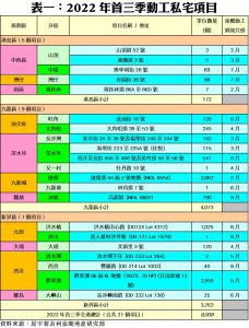 連同上述項目,2022年首9個月全港共有21個宅項目動工,涉及單位總數8,008伙。當中以九龍區的施工單位數量最多,涉及9個項目合共4,073伙,單位佔整體比例約50.9%;新界區有7個私宅項目動工,單位數量3,763伙,佔整體比率約47.0%;港島區則有5個項目、合共172個單位動工,佔整體比例約2.1%。