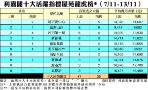 利嘉閣地產董事陳大偉表示,美國連番加息過後,當地通脹情況逐漸降溫,有望紓緩本港利率趨升壓力;而防疫放寬、港股反彈亦為市場注入動力,市民對後市信心逐步向好。綜合利嘉閣地產分行數據所得,全港十大活躍指標屋苑在上周(7/11–13/11)錄47宗買賣個案,較前周(31/10–6/11)的35宗增加34%,每個屋苑平均錄約4至5宗成交。