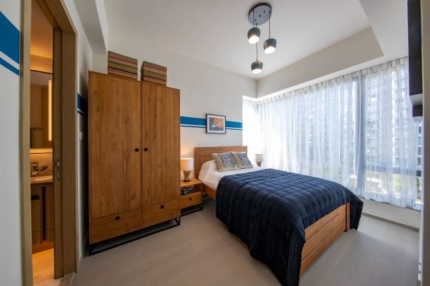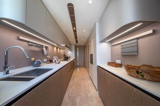 單位室內設計採用的物料以可持續柚木為主,層與層之間約3.15米高,飯廳放置實心柚木餐桌椅,客廳連接52方呎露台,外望吐露港景致。廚房採傳統梗廚設計,設有雙邊工作枱,家電一應俱全,外連工作平台。所有睡房均設有觀景大窗,有助採納室外光線。
