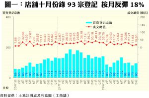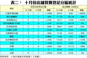 以地區劃分,在本行觀察的13個分區當中,共有8個地區的登記量按月上升,當中以紅磡/土瓜灣區的4.5倍升幅最凌厲,由九月的2宗增至十月的11宗。至於元朗區及大埔區也分別樣錄得2倍及1倍的升幅,各自增至6宗及4宗買賣登記。另外,長沙灣/深水埗區則按月增42%,錄得17宗登記,成為買賣最活躍的觀察區,反映民生消費區的店舖買賣仍較熱鬧。不過,荃灣區則逆市大跌,月內未有錄得任何登記,較九月的8宗明顯遜色;而尖沙咀/佐敦區亦急跌六成至只有2宗買賣登記。