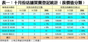 按物業價格劃分,在7個價格組別當中,共有4個組別的登記量報升,升幅介乎6%至88%不等。當中以500萬至1,000萬元以內組別的登記量升幅最顯著,由九月的8宗增至十月的15宗,增幅達88%。至於200萬元以下的細價組別亦升38%至29宗,並成為登記量最多的組別(詳見表一)。另外,上月最矚目的大額登記為土瓜灣馬頭圍道209號海悅廣場連停車場,涉及登記金額4.25億元;其次為銅鑼灣羅素街8號英皇鐘錶珠寶中心19樓,涉資1.1億元。