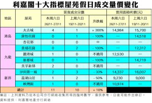 利嘉閣地產總裁廖偉強表示,二手市場氣氛雖稍見好轉,但整體而言,市場信心仍然不足,加上經濟表現仍然差勁,令成交只能微步回升,續於低雙位數徘徊。現時二手樓價已回調兩成,令樓價出現一定的「水位」,部分買家亦趁機大手還價,隨着業主面對現實割價,遂令部分大型屋苑成交量不致於「捧蛋」,甚至逐步回穩。綜合利嘉閣地產分行網絡數據,在過去的周六日(11月26日至11月27日)十大指標屋苑累計錄得11宗二手成交個案,與之前一周(11月19日至11月20日)比較微升1宗。