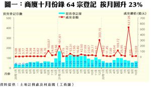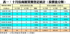 十月份商廈買賣登記出現量值齊升,當中登記金額增加25%,造就月內商廈買賣登記金額重上十億元水平,錄得10.09億元,但仍屬年內的第3低月份。至於,十月份最矚目的商廈單一登記項目為中環皇后大道中118至120號全幢,涉及合約金額2.75億元;其次是葵涌新都會廣場2座35樓3507室的3,010萬元登記;再者為荃灣新盤─國際企業中心3期5樓03室的2,233萬元。
