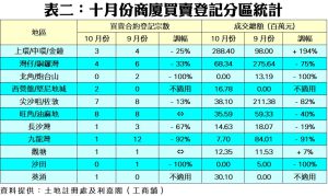 以地區劃分,在本行觀察的11個分區當中,共有2區的登記量按月上升,7區下跌及2區持平;當中西營盤/堅尼地城區及葵涌區雙雙由前月的零登記,分別增至錄得2宗及1宗登記。至於跌幅較顯著的兩區包括北角/炮台山區及沙田區,各自由前月的2宗及1宗跌至上月零登記。此外,九龍灣區月內僅錄得1宗買賣登記,較九月的12宗也急挫92%;而旺角/油麻地區則錄8宗登記,按月表現持平,並成為月內登記量最活躍的觀察區。