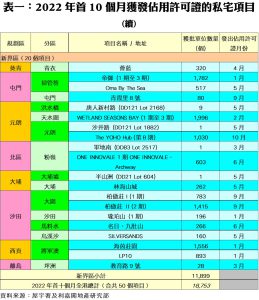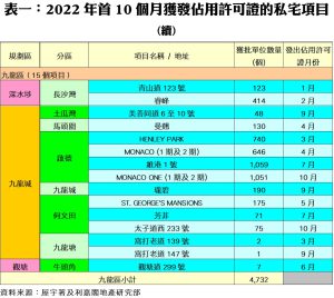 根據資料顯示,十月份本港共有3個私宅項目正式落成,當中規模最大的是啟德MONACO ONE發展項目(包括1期「MONACO ONE」及2期「MONACO MARINE」),涉及1,051個單位;此外,元朗「The YOHO Hub」(第B期)(1,030伙),以及何文田太子道西233號(75伙),亦於期內竣工(詳見表一)。