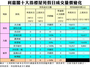 《利嘉閣十大指標屋苑假日二手實況》 中港通關效應帶動 買家入市意欲增 十大屋苑周末12宗成交 聖誕假4天錄21宗