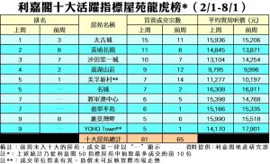利嘉閣地產董事陳大偉表示,中港通關帶動本港經濟復甦,業主趁機反價、封盤,買家眼見樓價開始轉向回升,不惜追價入市,二手交投轉趨活躍。綜合利嘉閣地產分行數據所得,全港十大活躍指標屋苑在上周(2/1–8/1)錄81宗買賣個案,較前周(26/12–1/1)的65宗增加25%,每個屋苑平均錄約8宗成交。