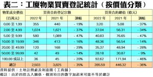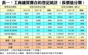 回顧2022年表現,以登記宗數計算,工廈、商廈及舖位買賣登記均全線下挫;當中以商廈登記量跌幅最大,去年僅錄得781宗,按年大減40%,陷入歷史次低水平,佔整體比例近18%。店舖方面亦錄得逾三成半跌幅,共錄1,147宗登記,按年少35%,佔整體比例近26%。至於工廈繼續成為工商舖整體市場佔比最多的類別,達逾56%,去年錄得2,503宗登記,但按年亦跌近35%。