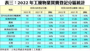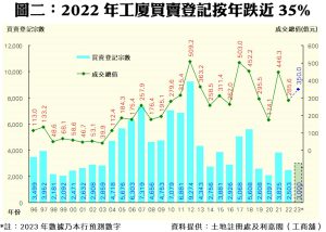 2022年全年累計,工廈買賣登記共錄得2,503宗,較2021年度的3,825宗大跌35%,涉及買賣合約總值285.59億元,相應回落36%;宗數為2001年起計22年以來的次低水平,亦為史上第5低。去年工廈全年登記量輾轉下跌,主要受年初疫情影響及年中起股市持續下跌及息口趨升所困擾,故自9月起,工廈登記量連跌4個月至全年按月最低位的115宗,回落至2020年初新冠病毒初爆發不久時的超低水平,反映淡市下,工廈成交難逃稀疏的命運。
