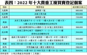 從地區層面分析,在本行定期觀察的十個主要工業區中,2022年登記量十居其九均錄得跌幅,其中跌幅最大的是黃竹坑/香港仔/鴨脷洲區,去年錄得48宗買賣登記,按年急挫65%,並成為登記量最少的觀察區。此外,觀塘及屯門區亦分別大減53%及51%,至各自只有221宗及148宗。至於葵涌、荃灣及觀塘區依然是買賣登記量最活躍的觀察區,惟去年3區登記量亦難逃跌幅,回落介乎8%至53%不等,分別達747宗、313宗及221宗(詳見附錄表三),反映工廈市場大都表現冷淡。唯一錄得升幅者是新蒲崗/黃大仙區,但按年亦只微增2宗而已。
