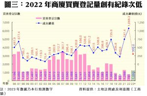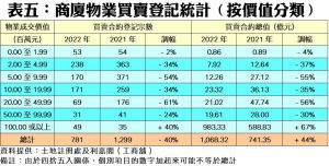 總結2022年全年,商廈整體買賣登記僅錄得781宗,較2021年的1,299宗急挫40%,跌至歷史次低,是繼2019及2020年後第3次史上不足千宗的低潮年。至於商廈買賣合約登記總值方面,去年背馳錄得44%的巨大升幅,高見1,068.32億元,繼2021年後,連續兩年在「疫」市之中迭創歷史新高紀錄,且為史上首度突破千億元;主因是去年分別錄得3項共859.64億元的巨額全幢商廈疑似內部轉讓登記帶動,分別是太古城中心一期(98.45億元)、交易廣場(518.01億元)及怡和大廈(243.18億元);倘撇除這些個案,實際登記金額約為208.68億元,按年跌近72%。