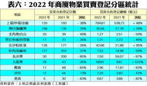 從地區層面分析,在本行定期觀察的11個主要商業區中(見附錄表六),2022年登記量全線下跌,當中跌幅最大者為長沙灣區,全年只錄得30宗登記,按年急挫85%;其次葵涌區亦跌83%,至5宗登記;而沙田區亦急跌73%至12宗,反映一些廠區商廈在疫情之下亦大受影響。另一方面,2022年最貴重的商廈登記個案除了前述3項巨額轉讓外,接著最矚目的登記為啟祥道17號全幢(前稱高銀金融國際中心)涉資的56億元,再者是彌敦道74至78號文遜大廈的近15.34億元,亦因此帶動全年總金額得以創下歷史新高。