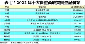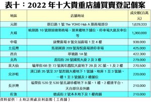 2022年十大貴重店舖買賣中(見附錄表十),最矚目者為元朗朗日路1號The YOHO Hub A期商場部分的近16.3億元登記;其次為大埔曉運路10號運頭塘邨商場、運來樓地下舖位、停車場大廈及車位等涉資的13.6億元。