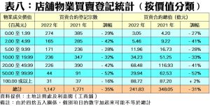 按物業價格劃分,去年7個價格組別的店舖買賣登記量錄得全線下跌,當中跌幅最大者為銀碼介乎5,000萬元至1億元以內的店舖,去年僅錄得44宗登記,按年急跌52%;其次為介乎200萬元至500萬元以內的組別,錄得165宗,按年跌42%;而2,000萬至5,000萬元以內者同跌42%,至226宗,反映各銀碼層店舖買賣均受打擊。至於去年買賣登記佔比最多者為200萬元以下的店舖,全年錄274宗,惟按年亦挫29%。