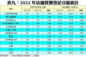 至於定期觀察的13個統計分區之中,去年錄得12跌1升。在下跌地區之中,以大埔區的跌幅最嚴重,由2021年的65宗大減57%,至2022年的28宗登記;其次觀塘區亦挫53%,至19宗,而荃灣區也跌48%至44宗。至於一些以遊客生意為主的傳統核心區表現仍然受壓,例如灣仔/銅鑼灣一帶的店舖去年只有45宗買賣登記,按年少36%;而尖沙咀/佐敦區及上環/中環/金鐘區亦分別錄得33%及15%的跌幅,去年全年分別只有72宗及44宗登記,反映去年無論是遊客區及民生區大部分均表現不濟。