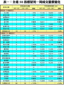 至於,港島區8個指標屋苑上周共錄19宗成交,較前周的24宗減少21%,當中康怡花園上周僅錄2宗買賣,較前周的4宗減少50%;杏花村及藍灣半島分別錄得4宗及2宗成交,按周減幅各有33%;藍籌屋苑太古城成交量由前周的8宗,減少25%至上周的6宗。此外,在全港50個指標屋苑當中,上周共有6個屋苑錄得「零成交」,較前周的13個減少54%,當中九龍區佔4個屋苑,港島區及新界區則各佔1個(詳見表一)。