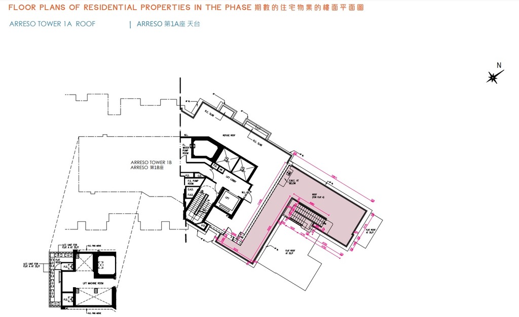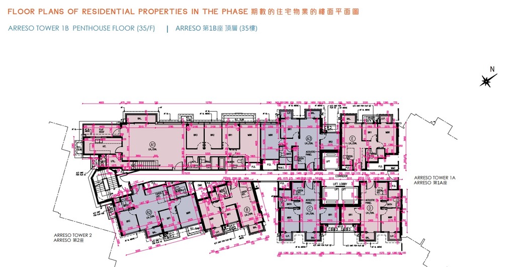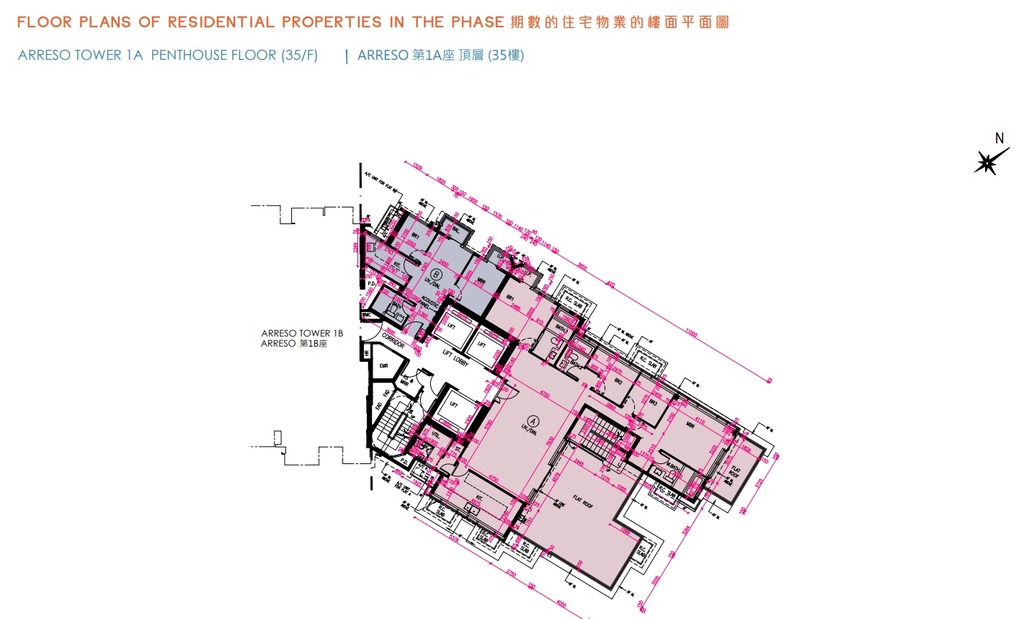 至於連天台僅設5伙,分別為Arreso第1A座35樓A室、Arreso第1B座35樓A1室,以及Arreso第2座A1至A3室,實用面積介乎1,093至1,429平方呎。當中面積最大為Arreso第1A座35樓A室,實用面積1,429平方呎,設4房雙套、儲物室及工作間連廁,甫入單位即見曲尺形大廳,空間分明,盡頭為梗廚所在,內接儲物室及工作間連廁。另一端則為4間房間所在,一字排開,由走廊連接。主人套房及客廳分別外連一個平台,面積合共464平方呎。另外,客廳外連的平台設內置樓梯通往天台,天台面積為789平方呎。另外,主人套廁對出有一定空間,可用以放置衣櫃,用作小型衣帽間。