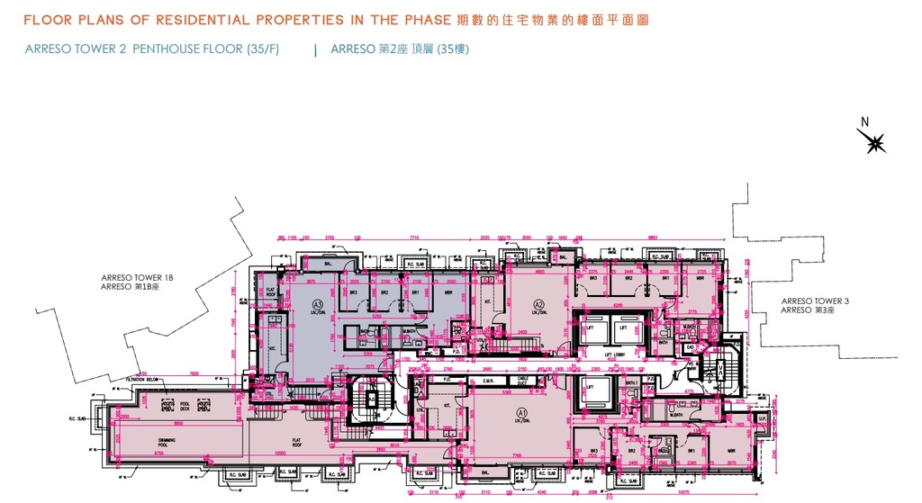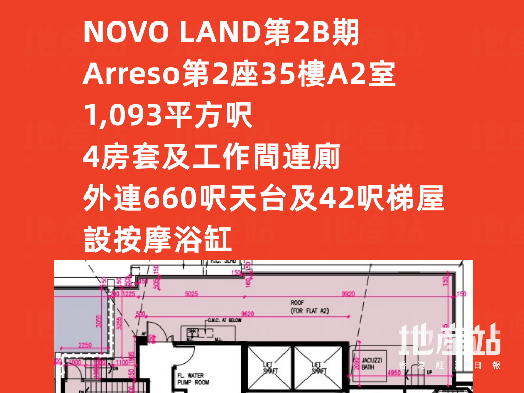 另外,Arreso第2座35樓A1室,實用面積1,409平方呎,同為4房雙套及工作間連廁間隔,設梗廚,外連797平方呎平台及842平方呎天台,賣點為設有游泳池。至於Arreso第2座35樓的A2及A3室,天台均附連按摩浴缸。