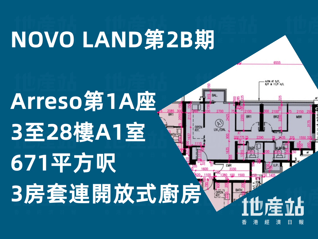 NOVO LAND第2B期的3房套單位可分為連開放式廚房及連梗廚兩種,並以連開放式廚房居多;此類單位可見於Arreso第1A座3至33樓A1室,以及Arreso第2座3至33樓A1室,實用面積分別為671及703平方呎。當中後者大門前設有玄關,提供足夠空間安放鞋櫃;而前者則未有提供相關空間。兩者均設有日字形大廳,以中央的走廊區分兩廳空間,布局方便。客廳另設落地玻璃趟門連接露台。至於3間睡房與廳同向,主人套房盡頭亦有預留衣櫃位。不過,只有Arreso第2座3至33樓A1室的主人套房外連工作平台。
