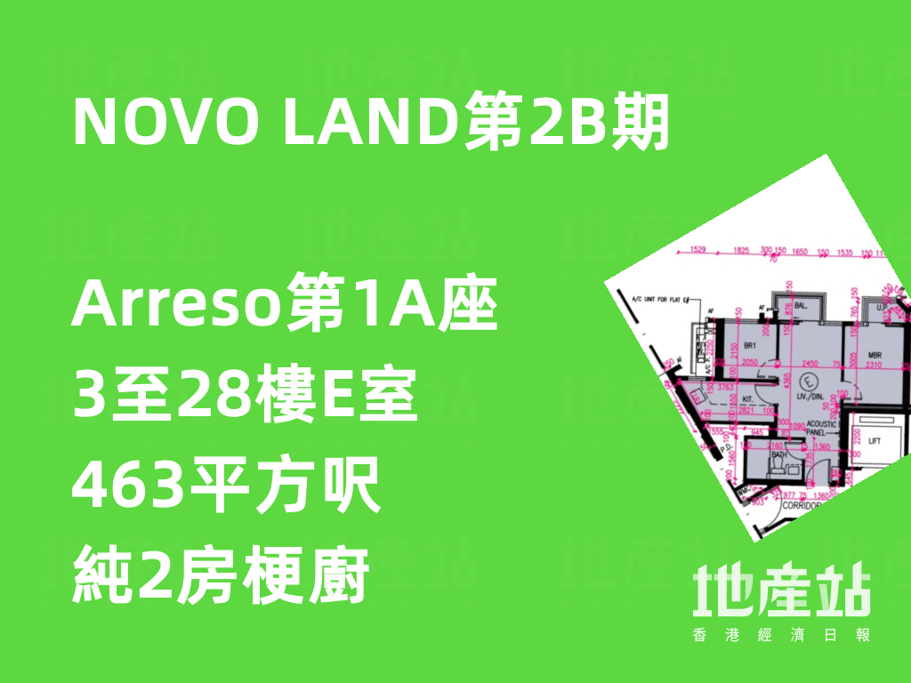 屯門NOVO LAND坐落於欣寶路8號,分6期發展,是次推出的NOVO LAND第2B期,坐落於商場「NOVO WALK」上蓋,設有兩座住宅大廈,分別為Arreso第1A座、Arreso第1B座及Arreso第2座,每座31層高,合共提供729伙,戶型由1至4房,實用面積介乎277至1,429平方呎;其中標準戶型介乎1房 (連套房) 至3房套,實用面積298至703平方呎。NOVO LAND第2B期的預計關鍵日期為2024年5月17日。