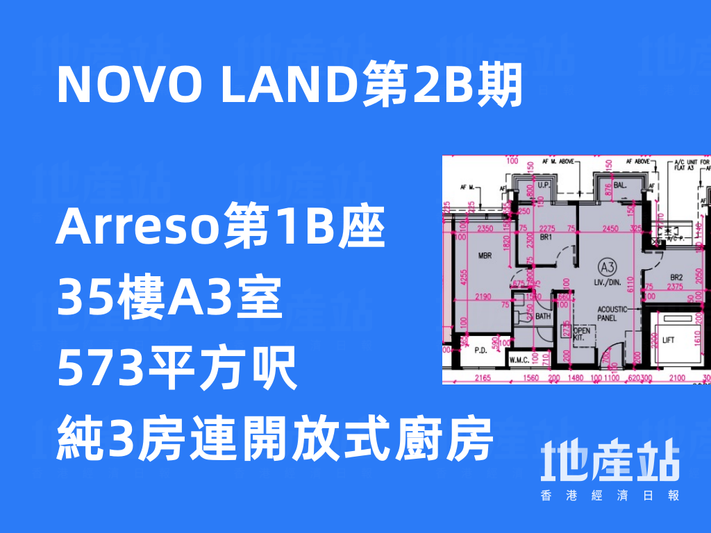 NOVO LAND第2B期唯一的純3房單位,位於Arreso第1B座35樓A3室,實用面積573平方呎,大門旁邊即為開放式廚房,同樣設長方形大廳,3間睡房與廳同向,座向西北,當中睡房2比鄰客廳,大門區分兩廳空間;至於另外兩房則由走廊連接。另外,睡房1外接工作平台,提供額外戶外空間。