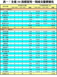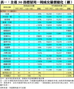 至於,港島區8個指標屋苑上周共錄33宗成交,較前周的30宗增加10%,當中鯉景灣上周錄得5宗買賣,較前周的2宗急增1.5倍;南豐新村交投量由前周的3宗,增加67%至上周的5宗;康怡花園及杏花村分別錄得7宗及4宗成交,按周增幅各達17%及33%。此外,在全港50個指標屋苑當中,上周共有5個屋苑錄得「零成交」,較前周的3個增加67%,當中港島區及九龍區各佔1個屋苑,新界區則佔3個(詳見表一)。