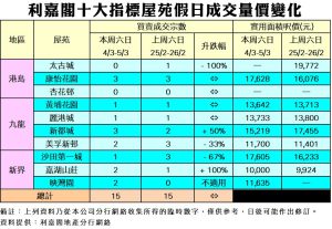 《利嘉閣十大指標屋苑假日二手實況》 新盤相繼開售吸客 二手市場暫難衝高 十大屋苑周末錄15宗買賣 樓價持續回升