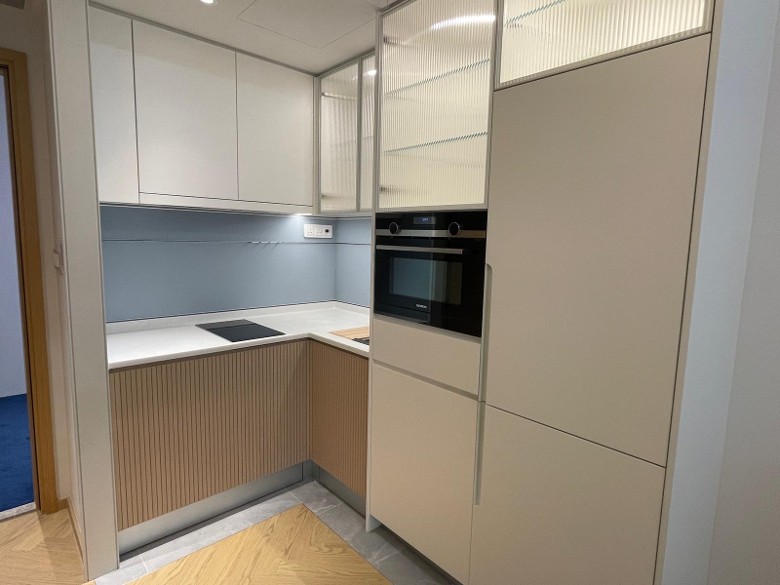 另一個示範單位參照22樓Q室,實用面積454方呎,兩房間隔,同樣採用開放式廚房設計,配備爐具家電,長方形客飯廳便於擺放傢俬。