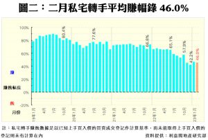 另外,數據顯示今年二月份每宗私宅轉手個案平均賺幅為46.0%(見圖二),按月微跌0.7個百分點,惟仍屬近4個月次高水平。二月份,帳面獲利1倍或以上的轉手個案佔整體二手私宅買賣比例為37.9%,按月升0.6個百分點,共錄965宗;至於帳面錄得虧損者達396宗,佔比按月回落1.6個百分點至15.5%,為近4個月以來低位;而平手的個案則有13宗,佔比也降至0.5%。