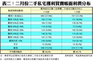 按物業區域劃分,二月份新界區表現最理想,以86.1%之數超越港島成為獲利成功比率最高的分區,按月並升2.5個百分點;其次為港島區,報84.0%,按月更升5.2個百分點;至於九龍區表現相對遜色,只錄得79.1%,且按月跌1.7個百分點。按物業轉售價格分析(見表一),樓價介乎801萬至1,000萬元的中價樓組別之獲利比率最高,錄得87.9%,按月大增12.3個百分點,涉及宗數371宗;此外,601萬至800萬元組別,月內獲利比率亦達87.8%,按月也升2.2個百分點,表現亦跑贏整體大市。