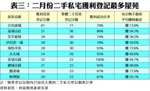 此外,檢視上月10個獲利登記最多的屋苑,當中只有黃埔花園成功錄得百分百獲利,獲利成功比率次高者則為麗城花園的95%,再者為海怡半島的93%。此10個屋苑當中,每宗平均賺幅介乎最少的12.8%至最多的94.7%不等。當中嘉湖山莊及黃埔花園雙雙成為錄得每宗轉手個案平均賺幅最高的屋苑,同達94.7%。至於上月榜內賺幅最低者為樓齡相對較低的日出康城,平均每宗只賺約12.8%,而次低者為美孚新村的36.2%(見表三)。