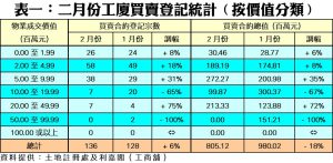 按物業價格作分析,在7個價格組別的工廈買賣登記當中,二月份錄得4升2跌1持平(詳見表一);當中以銀碼介乎2,000萬至5,000萬元以內組別登記量升幅最顯著,由前月的4宗,大增75%至上月7宗。另外,500萬至1,000萬元以內及200萬至500萬元以內的兩個組別,亦分別升31%及18%,各自錄得38宗及58宗登記;當中後者更成為月內登記量最活躍的組別。值得注意的是,上月並無5,000萬元或以上的貴重工廈登記,相信與農曆新春傳統淡市有關,大額買賣暫時轉靜。