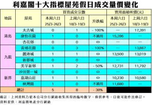 利嘉閣地產總裁廖偉強表示,多個新盤齊推搶佔市場客源,凍結大批購買力,反映發展商決心推盤,而且具備以吸引價格推售的條件;另一邊廂,二手業主並不急於放盤,並對後市持正面態度,在此消彼長之下,客人轉投較吸引的一手市場,令二手交投量較為受壓。綜合利嘉閣地產分行網絡數據,在剛過去的周六日(3月25日至3月26日)十大指標屋苑僅錄5宗二手成交,較對上的周六日(3月18日至3月19日)的8宗減少38%,創自去年十一月中以來的二十周新低。