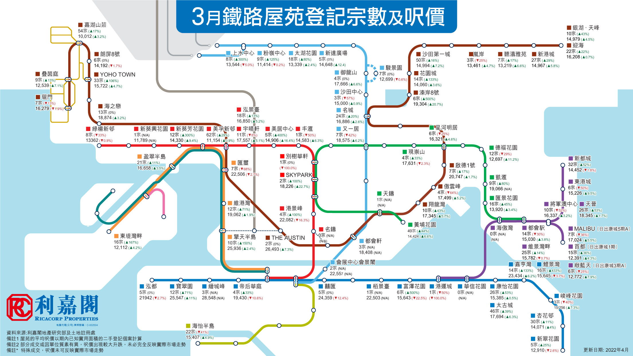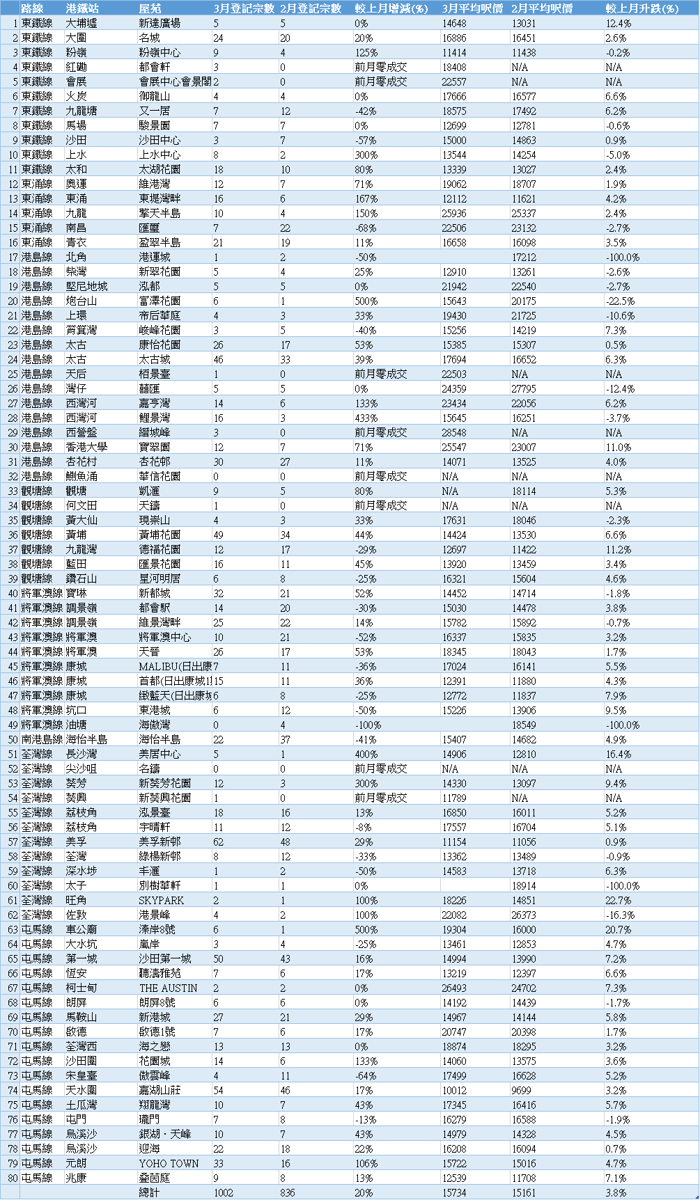 【鐵路屋苑】3月鐵路屋苑登記宗數及呎價