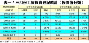 按物業價格作分析,在7個價格組別的工廈買賣登記當中,三月份錄得5升1跌1持平(詳見表一);當中以銀碼介乎1,000萬至2,000萬元以內組別登記量升幅最突出,由前月的7宗,激增8.7倍至上月的68宗,主因是有工廈拆售而錄得多宗相關銀碼之登記。另外,2,000萬至5,000萬元以內及500萬至1,000萬元以內的兩個組別,亦分別升2.6倍及82%,各自錄得25宗及69宗登記;至於200萬至500萬元以內者則成為月內登記量最活躍的組別,共錄104宗登記,按月也升79%。值得注意的是,上月並無1億元或以上的貴重工廈登記。
