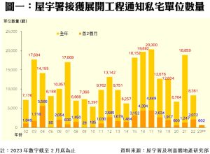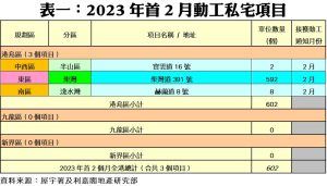 連同上述項目,由於一月時錄得「零動工」,故2023年首兩個月全港就只有上述3個私宅項目動工,涉及單位總數602伙,當中港島佔比達100%。