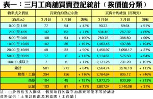 按工商舖三個物業類別劃分,工廈三月登記量升幅強勁,登記宗數為近14個月最多,以宗數計蟬聯登記量最多的類別,佔整體比例增至58.7%。三月全月工廈共錄得294宗買賣登記,按月上升近1.2倍;而月內涉及買賣登記金額更達27.85億元,按月激增近2.5倍,創近8個月最多,主因受惠月內有多宗逾千萬元的拆售登記所撐起。