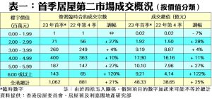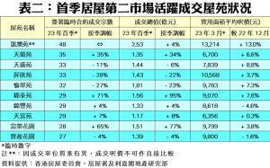 按物業價值劃分(見表一),今年首季共有5個組別交投量按季上升,其中價值600萬元以上組別交投升幅最為明顯,由去年末季的65宗買賣,急增至上季143宗,按季攀升1.2倍;至於最活躍的交投組別則為價值400至500萬元以內的居二單位,首季共錄得400宗成交,按季增加10%。若按屋苑劃分(見表二),以馬鞍山錦泰苑交投升幅最大,上季共錄29宗買賣,按季大增71%或12宗;上述屋苑成交總值亦同步增加95%至1.56億元。而長沙灣凱樂苑則以48宗買賣蟬聯交投最活躍的綠表居屋屋苑,連續兩季高踞榜首,上季成交總值共涉2.53億元。