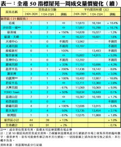 至於,九龍區21個指標屋苑上周共錄35宗成交,較前周的39宗減少10%,其中淘大花園交投量由前周的2宗,減少50%至上周僅得1宗;區內包括黃埔花園、海濱南岸、譽‧港灣、德福花園、新都城、維港灣、柏景灣及港灣豪庭上周均未聞交投,暫時「捧蛋」。此外,在全港50個指標屋苑當中,上周共有11個屋苑錄得「零成交」,較前周的10個增加10%,當中港島區及新界區各佔1個及2個屋苑,九龍區則佔8個(詳見表一)。