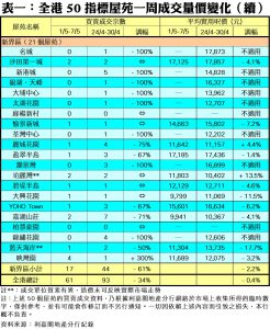 至於,九龍區21個指標屋苑上周共錄32宗成交,較前周的35宗減少9%,其中麗港城交投量由前周的8宗,減少75%至上周的2宗;維景灣畔期內錄得2宗買賣,按周減少50%;美孚新村成交量由前周的7宗減至上周的4宗,按周減幅達43%;昇悅居錄得2宗成交,較前周的3宗減少33%。此外,在全港50個指標屋苑當中,上周共有17個屋苑錄得「零成交」,較前周的11個增加55%,當中港島區及九龍區各佔1個及6個屋苑,新界區則佔10個(詳見表一)。