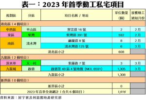 連同上述項目,2023年首季全港共有6個私宅項目動工,涉及單位總數1,916伙。當中以九龍區的施工單位數量最多,涉及2個項目合共1,308伙,單位佔整體比例達68.3%;港島區則有4個私宅項目動工,單位數量608伙,佔整體比率近31.7%;然而,新界區首季則暫未有項目展開動工。