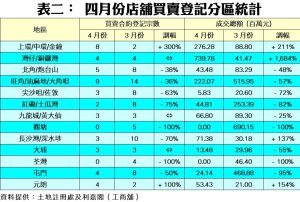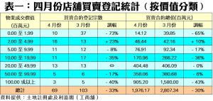 按物業價格劃分,在7個價格組別當中,共有5個組別的登記量報跌,跌幅介乎8%至73%不等。當中以200萬元以下及1億元或以上兩個組別的登記量跌幅最顯著,前者由三月的37宗大減至四月的10宗;後者則由5宗跌至3宗,減幅各達73%及40%。至於,1,000萬至2,000萬元以內組別買賣登記量亦挫35%至只有11宗。值得注意的是,200萬至500萬元以內組別買賣登記量表現則逆市上升23%,錄得16宗登記,並成為登記最活躍的組別,反映部分細價店舖續有承接力(詳見表一)。