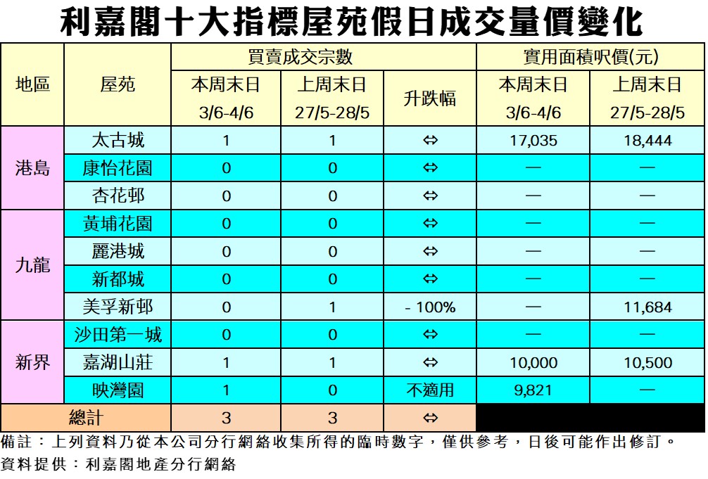 《利嘉閣十大指標屋苑假日二手實況》 股市波動 息口走勢未明 買家審慎觀望 十大屋苑周末錄3宗買賣 橫行未見突破 研究報告 2023-06-04 by Chan Derek · Published 2023-06-04