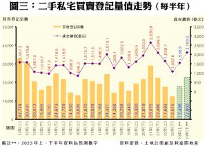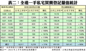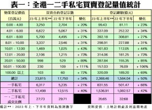 2022年在疫情肆虐下,樓市表現極差,下半年更在加息夾擊下,私宅市場買賣創了按半年計的歷史新低;不過,隨著2023年挾著通關的重大利好消息,住宅市場即時顯著反彈,自谷底回升、扭轉連環下瀉的命運。總結2023年上半年,一、二手私宅市場料共錄逾2.38萬宗買賣登記,涉及登記總金額料達2,368億元,量值按半年各漲三成及五成。