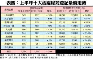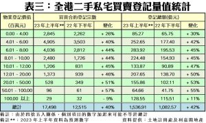 至於二手市場方面,預期也將受惠經濟復甦、原有以及可能加碼的首置按保成數放寬,將繼續帶動更多首置客及換樓客入市,預計下半年二手私宅交投量亦可較上半年的1.75萬宗再升三成,至近2.28萬宗;全年累計,二手買賣登記量料突破4萬宗水平,將較2022年約3.02萬宗大增33%。綜合預計,在下半年一二手同步齊升下,整體私宅交投量料升三成,最終料達3.1萬宗水平;而全年總計料錄約5.48萬宗,將較2022年的近4.02萬宗大漲36%。