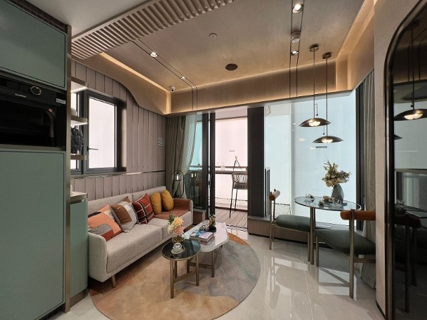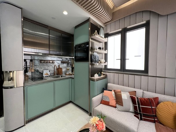 其中一個經改動示範單位參照18樓A單位搭建,為一房間隔,實用面積317方呎,屬項目最大的一房標準戶。單位客飯廳採用天然木紋拱門形天花板設計,廚房為開放式,廚櫃選用湖水綠色,露台與工作平台合併,實用面積達38方呎。