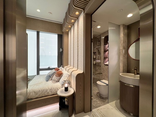 發展商同時開放屬於上述原則的無改動示範單位,可見原有間隔,浴室配備兩道門,一道通往客廳,一道通往睡房,營造套房感覺。
