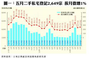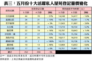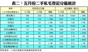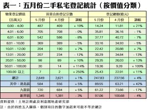 今年五月份,按二手私宅價值分類,9個價格組別的買賣登記量錄得五升四跌,當中以樓價1億元以上組別的2.5倍升幅最勁,登記量由前月的2宗大增至上月的7宗;而5,001萬至1億元者亦升1.1倍至30宗(見表一)。不過,登記量最活躍的401萬至600萬元組別則橫行微跌3宗,錄705宗;第二活躍的601萬至800萬元組別亦跌8%,月內錄542宗。