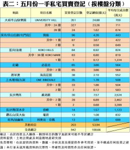 按樓盤分類(見表二),大埔UNIVERSITY HILL 2A期於五月份錄得327宗登記,成為月內登記量最多的一手私宅項目,登記總值達23.26億元,平均每宗登記約711萬元;其次為屯門飛揚1期的87宗。至於排行榜內上月平均每宗買賣成交價最高者為長沙灣西維港匯1期的3,399萬元;而飛揚1期的422萬元則為較低平均價者。